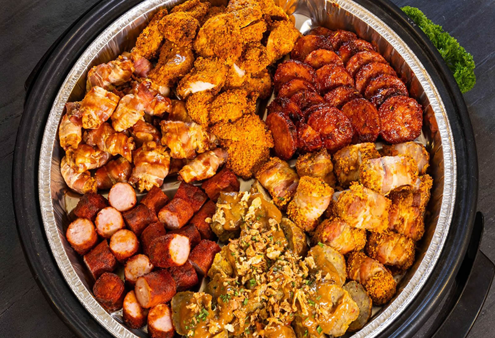 In de vleespan zit ca. 2 kilo aan Pulled Chicken en is voor ongeveer 12 personen.